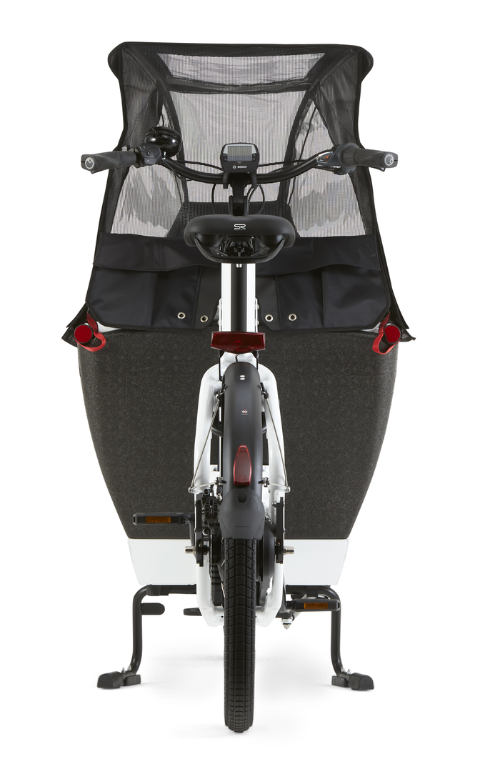 De voorkant van de regenhuif biedt significant meer ruimte voor de passagiers die op het extra voorbankje zitten. Mochten jouw kleintjes nou nog te jong zijn om zelfstandig op het bankje te zitten dan is daar ook aan gedacht. De Raincover PLUS biedt namelijk ruimte en een eenvoudige toegang om een Maxi-Cosi stoeltje in en uit de bak te halen. Zo kun je met gemak zelfs je jongste meenemen op al je ritjes.