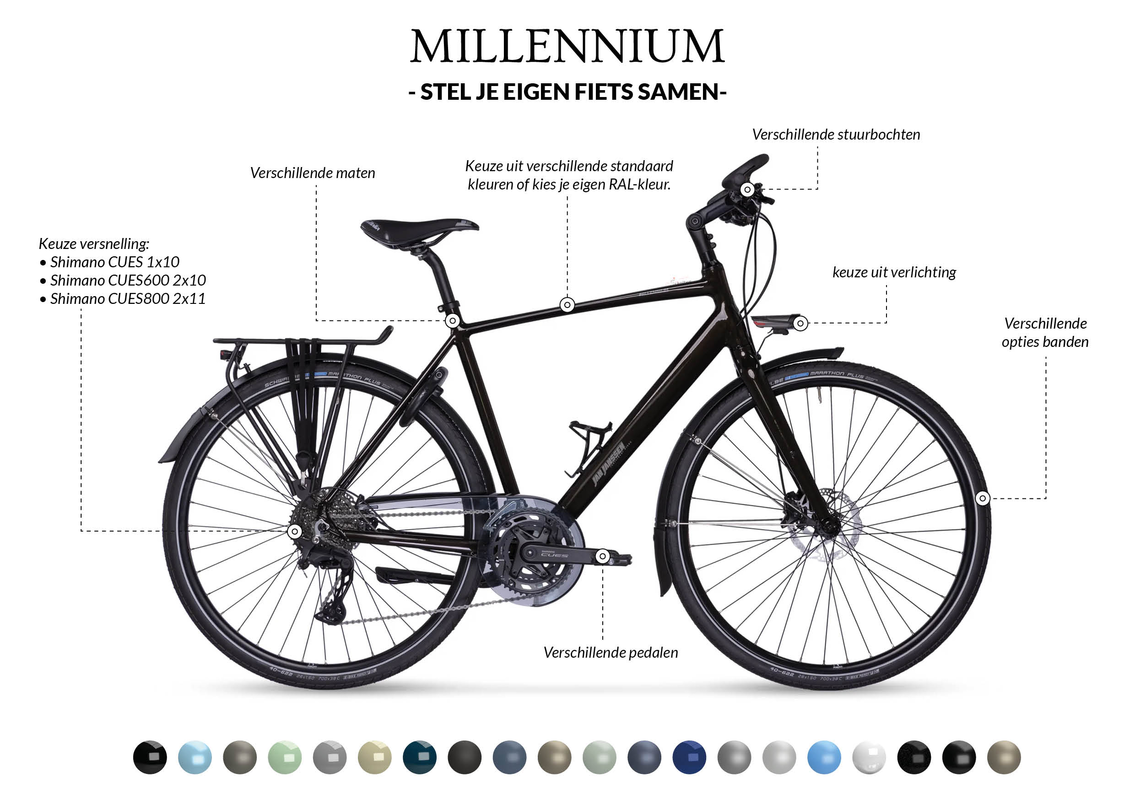Hoe goed je jouw fietsvakantie ook voorbereidt, een goede betrouwbare fiets, stabiel en met genoeg versnellingen is onontbeerlijk. De Millennium is zo'n fietsvakantie-klassieker die tot in de kleinste details fietsplezier ademt. Afhankelijk van uw ambities is hij samen te stellen met diverse Shimano componentgroepen.