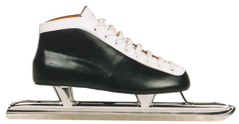 Klassieke lederen norenschaatsschoen met vetersluiting, leder gevoerd met verchroomde lage schaatshouder met verchroomde Japans stalen norenschaatsijzers.